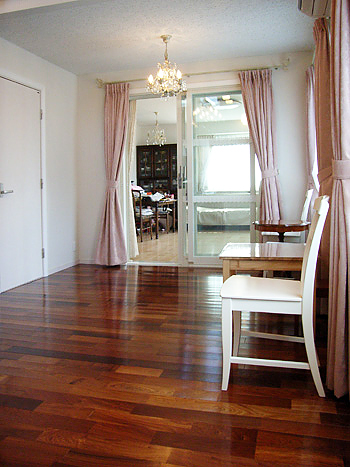 戸建住宅における防音性能は窓で決まる、と言い切っても良いほど、防音計画において窓は最重要ポイントです。H様のご自宅は閑静な高台の住宅地にあり、 音楽室の窓からは天気の良い日に遠く富士山を望むことができます。このせっかくの良い立地条件、良い眺望を、防音のためにあきらめてしまうのは あまりにももったいない。そこで、外壁側のサッシの内側に特注の木製防音窓を設置し、二重サッシとしました。ここでのポイントは、引き違い窓を使わずより気密性の高い開き窓か FIX窓を採用していることです。遮音性能は窓前1m地点における測定値でD'-60前後で、外では聞き耳を立てないとピアノの音は聞こえません。眺望もさることながら、陽光あふれる音楽空間が実現できました。