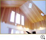 そこで、防音室工事でよく使われる吸音建材を最小限に抑えつつ、美しい響きを得られるよう音響設計を行いました。その最大の特徴が無垢板材をふんだんに使った天井にあります。 木はアコースティック楽器にも用いられるように 優れた音響特性がありますが、ここではもう一工夫加え、裏側に吸音層を設けて板振動による低音の吸音効果を狙っています。カーテンやカーペットなどの布状の素材では吸収しにくい低音を吸って、逆に中高音は温かみのあるやわらかい 反射音を返してくれます。